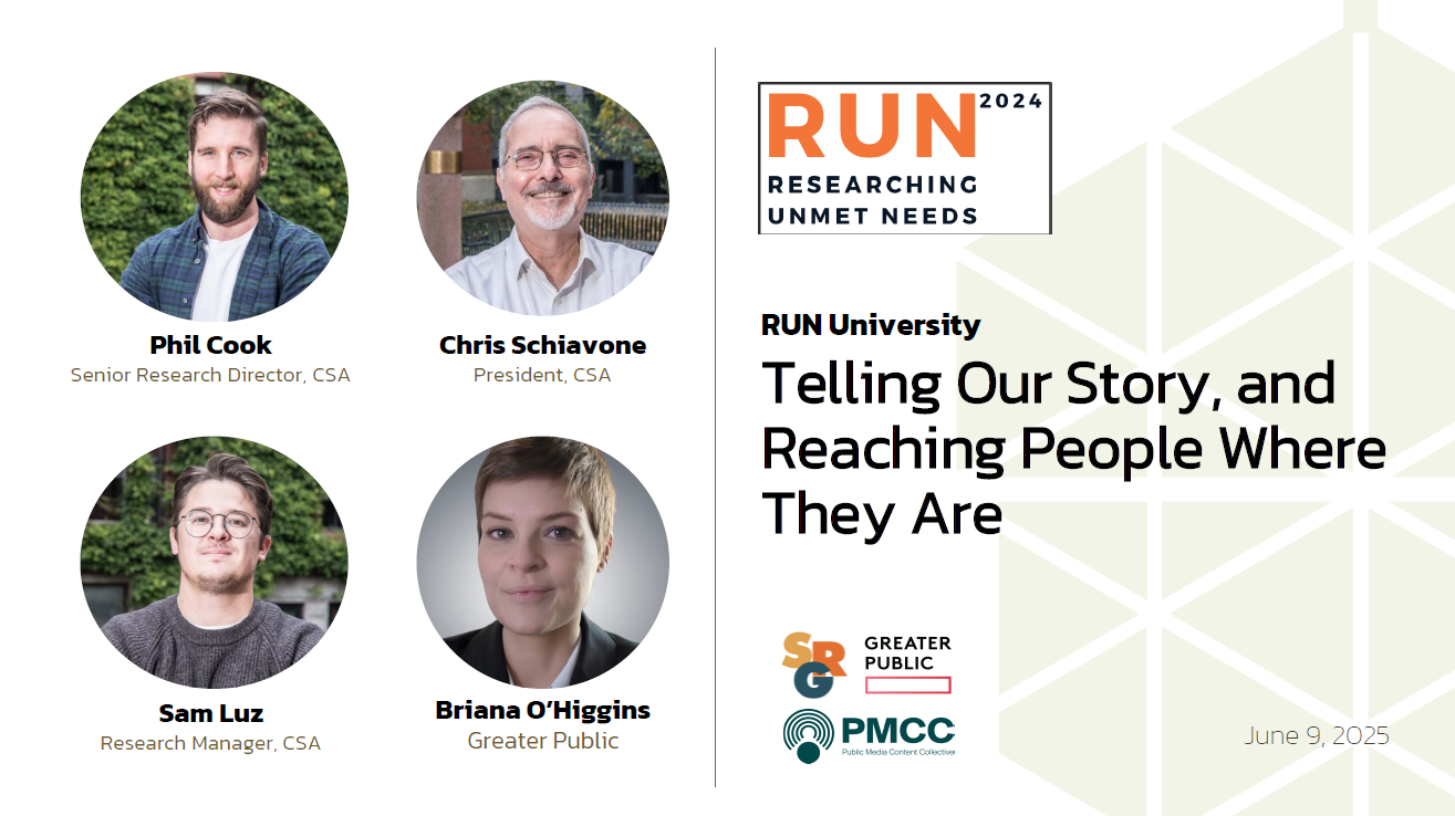 “Researching Unmet Needs, commissioned last year by the Station Resource Group, Public Media Content Collective and Greater Public was conceived well before the 2024 election. It was not conducted to arm public media advocates with field-tested talking points on how to best make the case for supporting public media in today’s partisan atmosphere. Instead, its goal was to help public radio meet its mission of serving all Americans…”