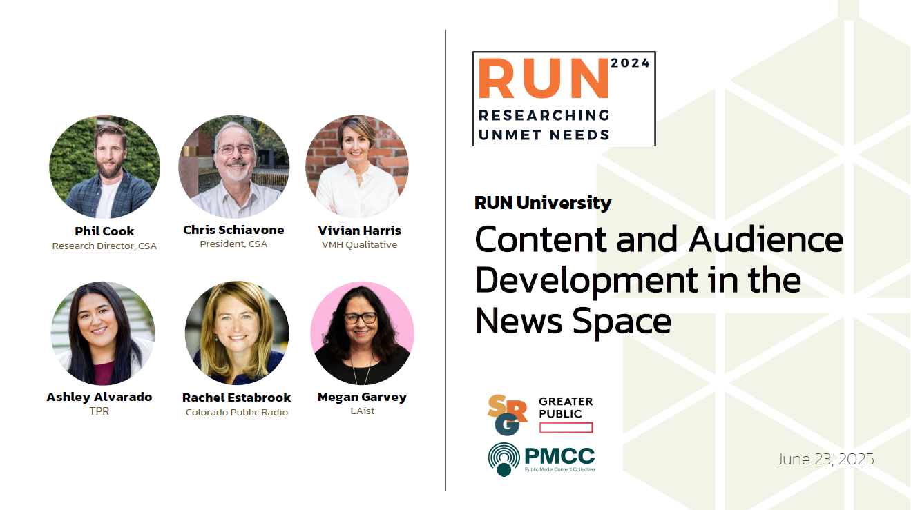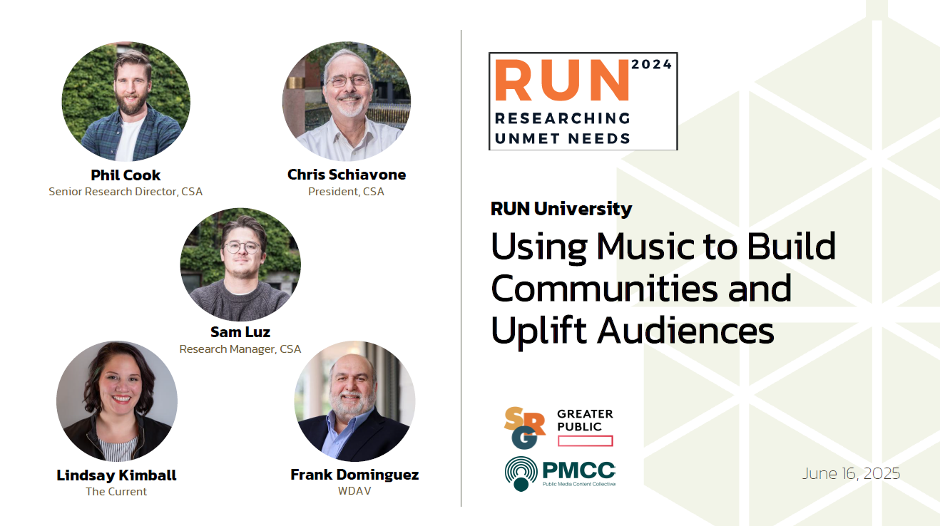 “RUN 2024 is designed to identify the unmet needs of music and news and consumers in all 50 states and look for opportunities where public media is uniquely positioned to meet those needs. Our study includes local market modules that will give public broadcasters important data and insights into their own service areas…”